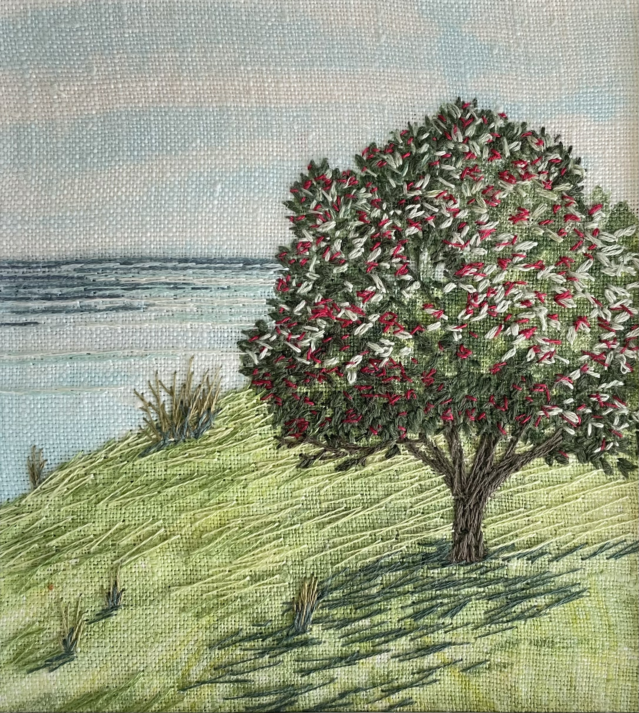 Original stitched painting 'Pohutukawa', embroidery thread and acrylic on linen by Sara Langdon.