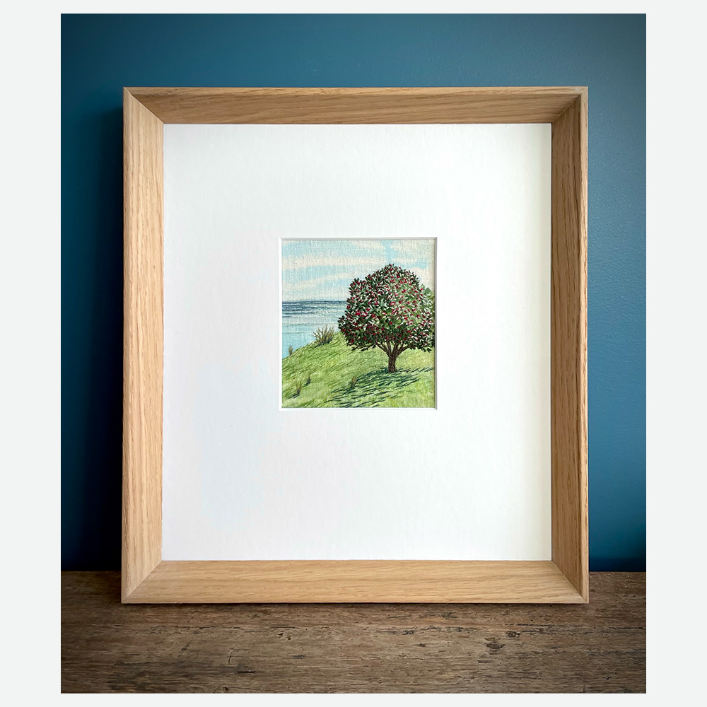 Part of my 'freehand stitch' practice which runs alongside my fine art painting practice, this piece draws inspiration from the New Zealand coastline. A subtle backdrop of acrylic washes holds intricately hand-stitched landscape details.